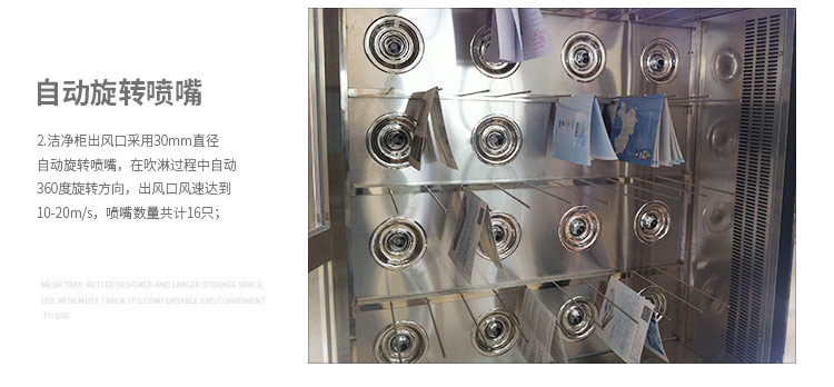 2. 潔凈柜出風(fēng)口采用30mm直徑自動(dòng)旋轉(zhuǎn)噴嘴,在吹淋過(guò)程中自動(dòng)360度旋轉(zhuǎn)方向,出風(fēng)口風(fēng)速達(dá)到10-20m/s,噴嘴數(shù)量共計(jì)16只;